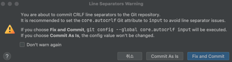 처음엔 안뜨던 warning이 갑자기 떠서 당황스러웠지만, 천천히 읽어보니 Git에서 라인 끝 설정과 관련된 문제를 경고하고 있었다.