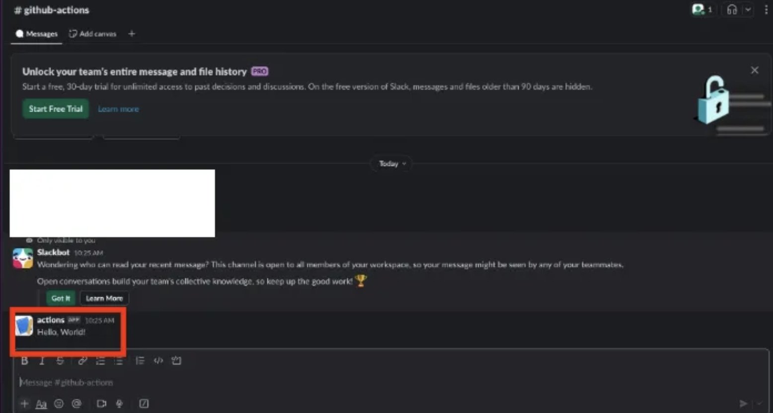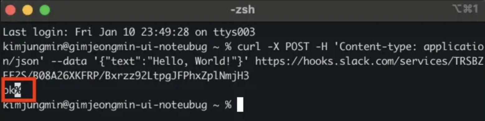 OK를 확인하고 슬랙 해당 채널에 Hello World 메세지가 출력된 것을 확인할 수 있다.