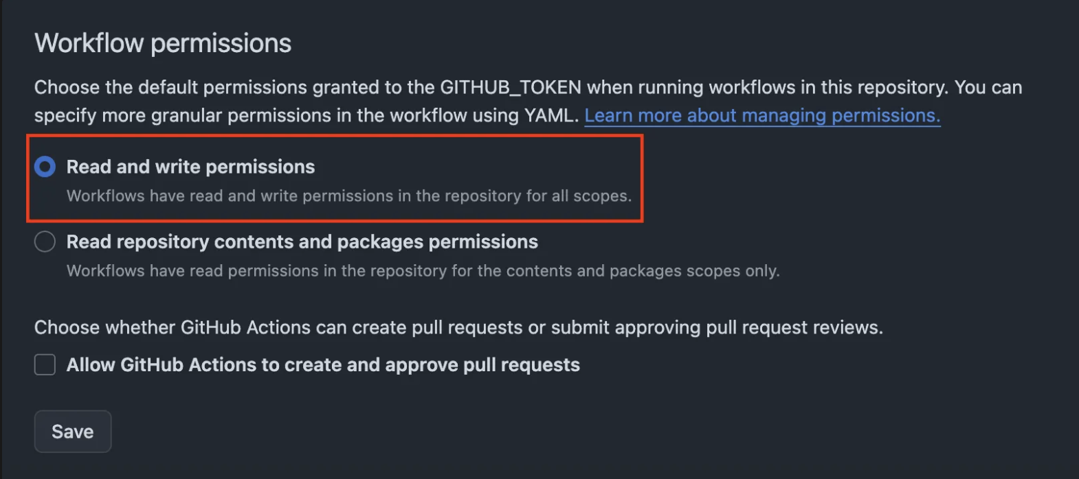 Workflow permissions을 Read and write permissions으로 변경한다.