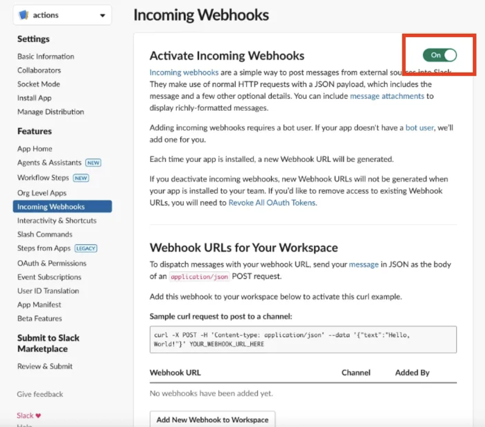 Features > Incoming Webhooks 에 들어가 활성화 시켜준다.