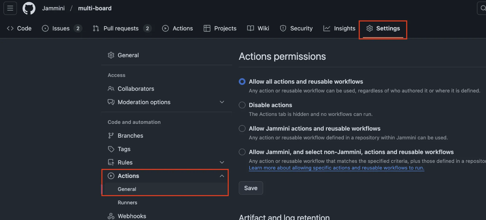 Repository에 Settings에 들어가 Actions > General 탭에 들어간다.