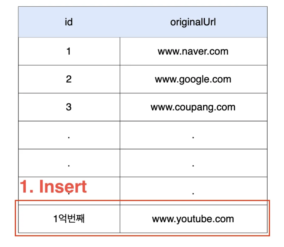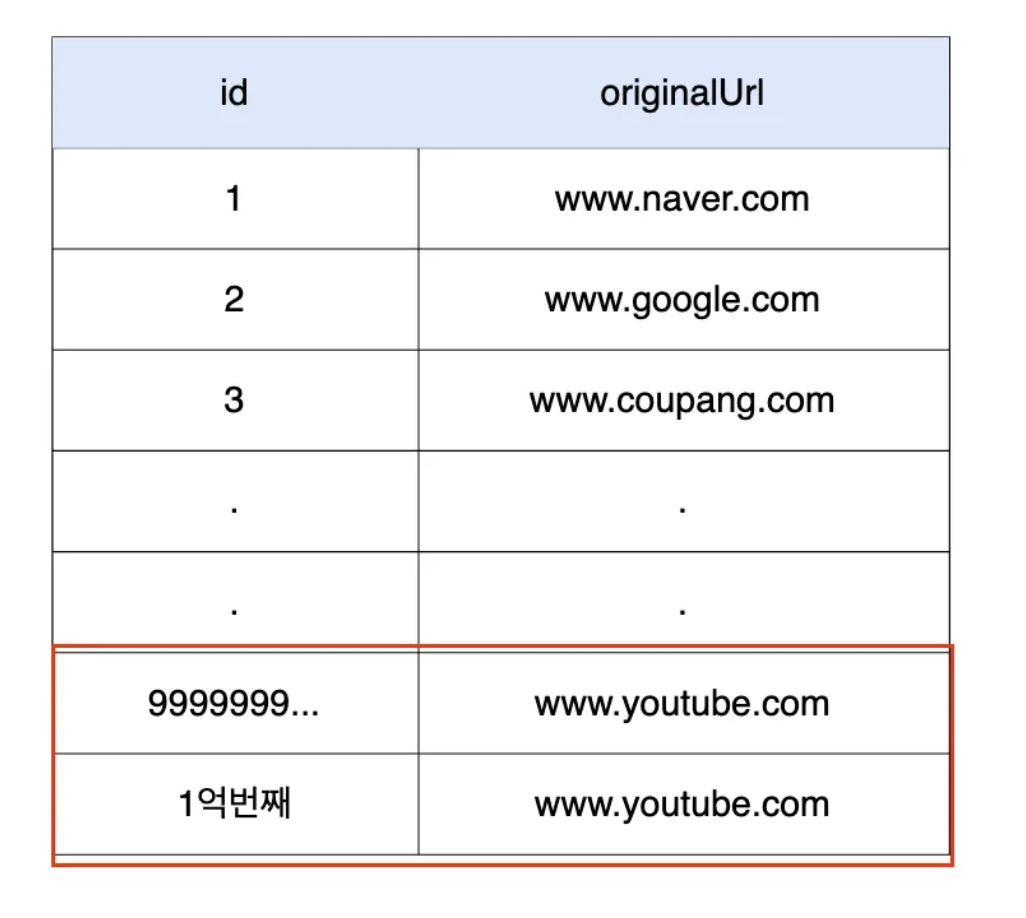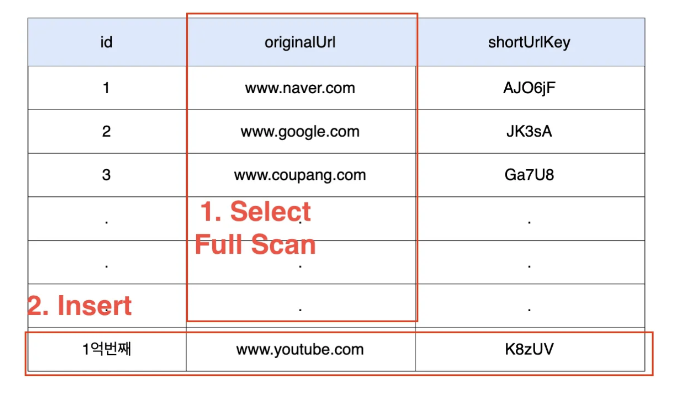 “www.youtube.com” 으로 단축 url 요청이 들어오면 originalUrl에 중복된게 없는지 첫번째부터 1억번째까지 Select 문을 통해 Full Scan이 일어날 것이다.