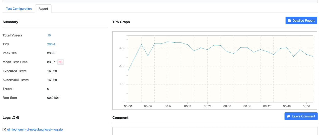 5만건의 더미데이터 환경에서 가상사용자 10명, 1분간 테스트한 결과, 새로운 URL 처리 시 INSERT 방식이 TPS 6.4배 향상(474.8 → 3,145.6), 중복 URL 처리 시 Redis 캐싱이 TPS 12.8(474.8 → 6092.1)배 향상을 달성하였다.