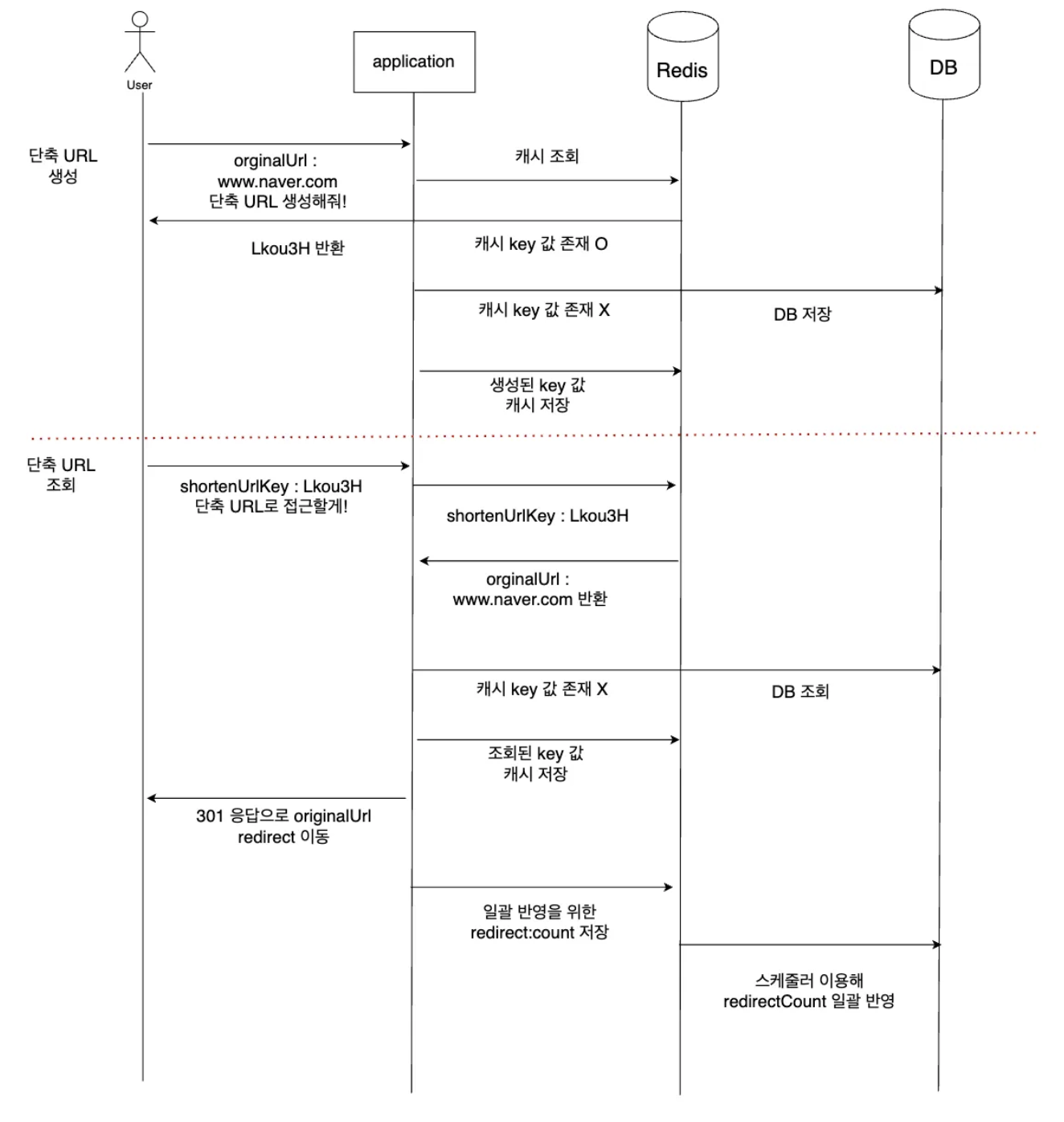 - 단축 URL 요청 → 캐시 조회 → DB SELECT → DB INSERT → 캐시 쓰기 (2회쿼리)