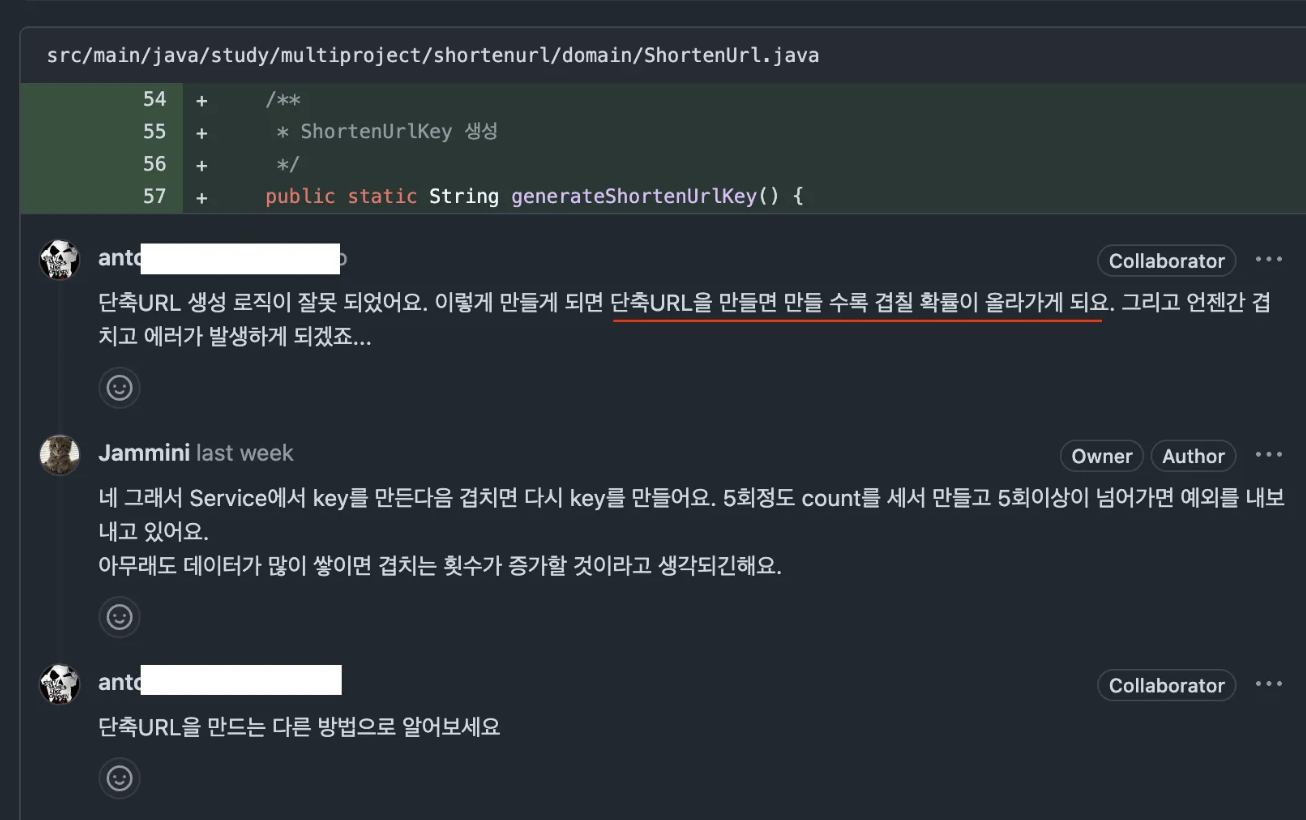 4-1 구현을 하고 코드리뷰를 받은 결과, 위 사진과 같은 리뷰가 달렸다. 겹칠 확률을 생각해 예외를 내보내고 있지만 더 좋은 방법이 있는지 생각해보았다.