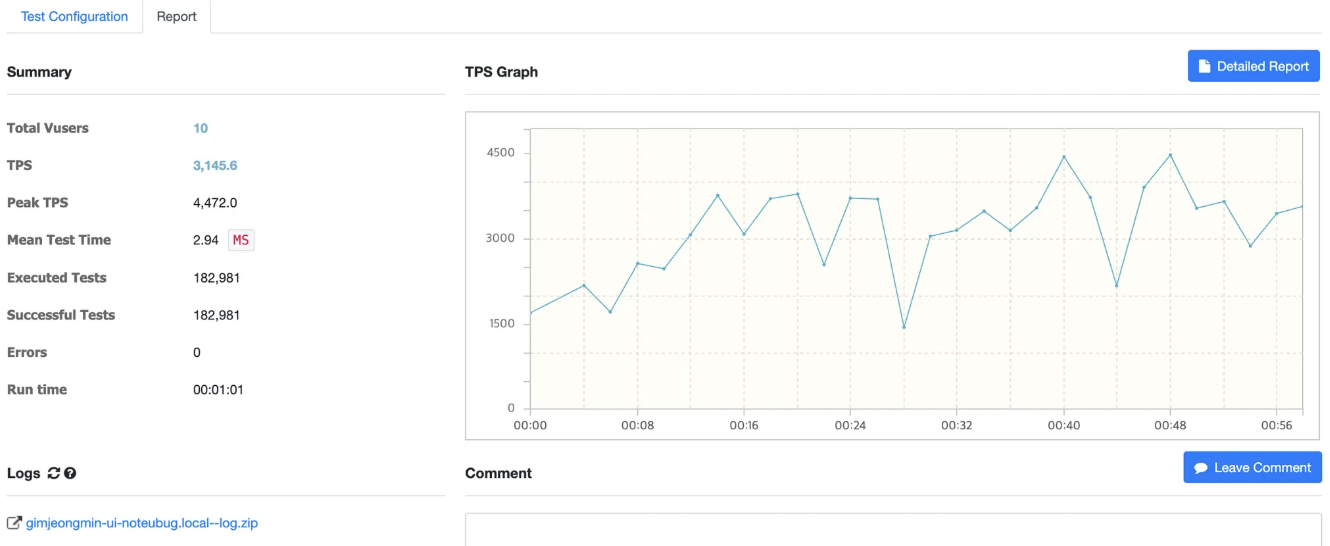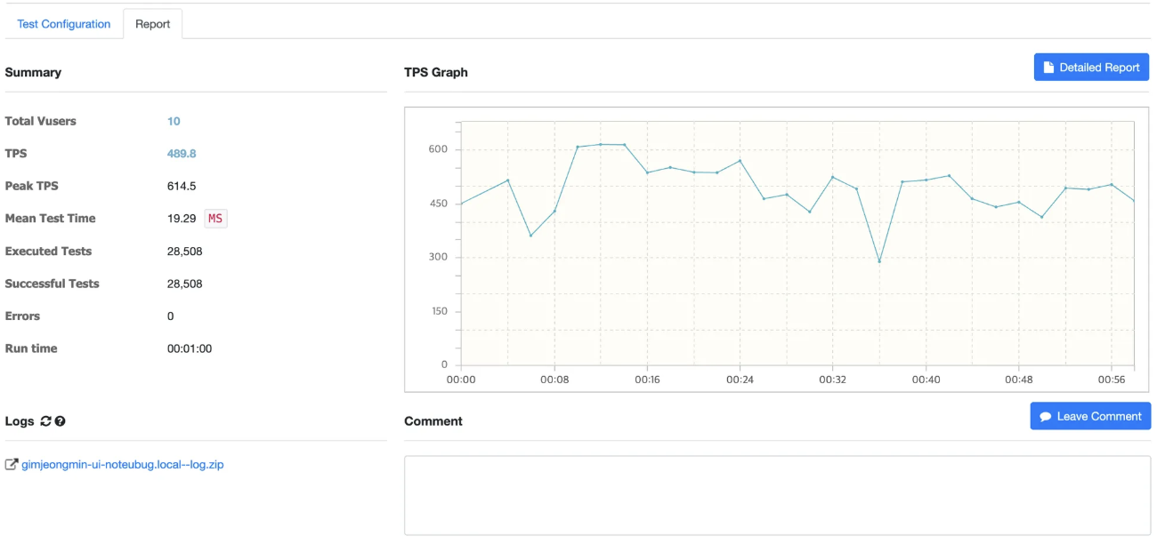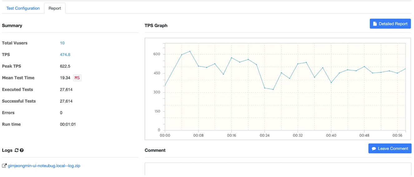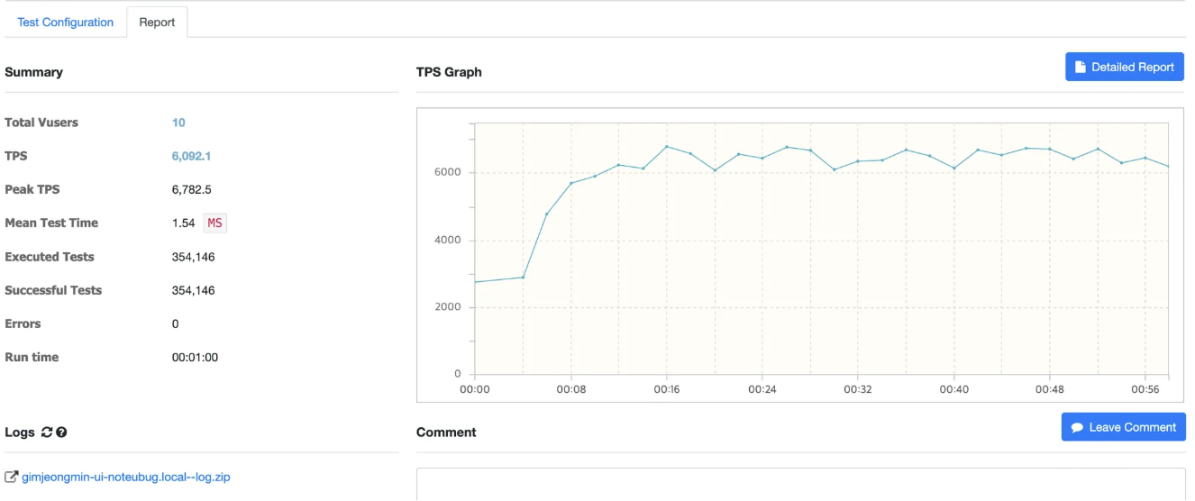 5만건의 더미데이터 환경에서 가상사용자 10명, 1분간 테스트한 결과, 새로운 URL 처리 시 INSERT 방식이 TPS 6.4배 향상(474.8 → 3,145.6), 중복 URL 처리 시 Redis 캐싱이 TPS 12.8(474.8 → 6092.1)배 향상을 달성하였다.