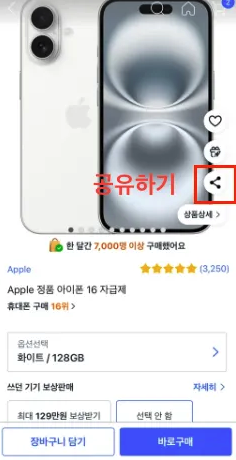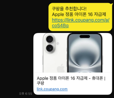 쿠팡에서 제공하는 공유하기 버튼을 눌러 카카오톡에 링크를 전달하면 아래와 같이 나온다.
