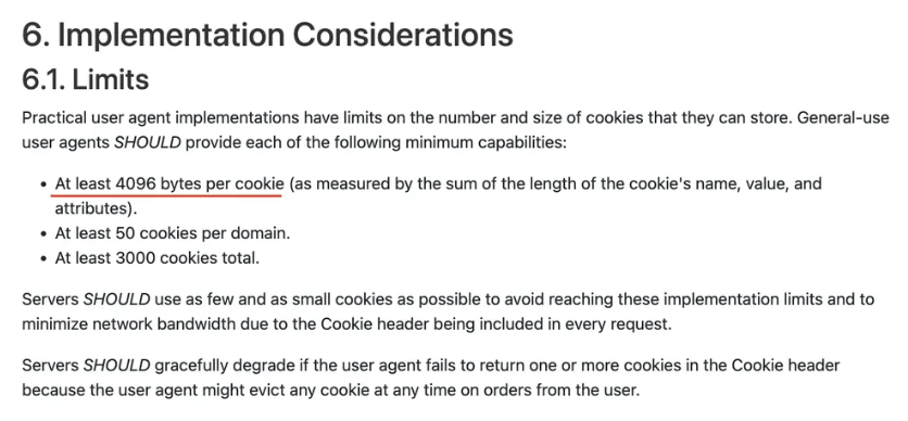 쿠키의 크기가 4KB로 제한된 이유는 RFC 6265(HTTP State Management Mechanism) 표준에서 명시적으로 "하나의 쿠키는 최소 4,096바이트(4KB)까지 저장해야 한다"고 규정했기 때문이다.