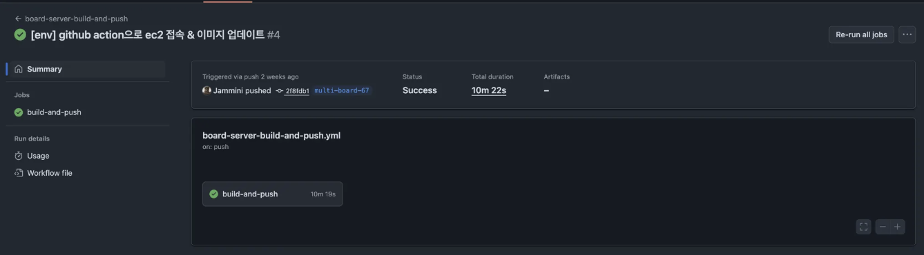 각 작업의 워크플로우 실행결과는 Github 를 통해 확인할 수 있다.