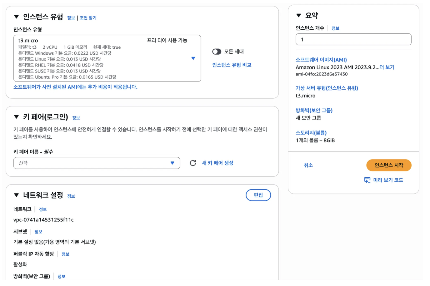 AWS 프리 티어 한도 내에서 비용을 사용하기 때문에 인스턴스는 t3.micro 를 이용하였다.
