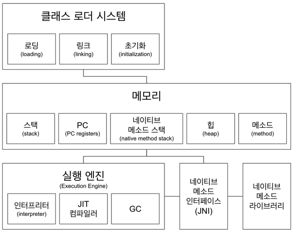 - 자바 가상 머신으로 자바 바이트 코드(.class 파일)을 OS에 특화된 코드로 변환(인터프리터와 JIT컴파일러)하여 실행한다.