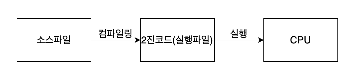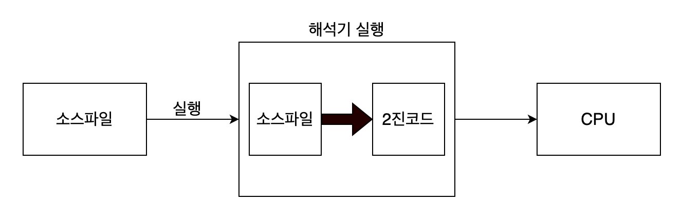 - 소스 파일을 해석 엔진 프로그램(interpreter)을 이용해 소스를 한 줄 씩 실행한다.