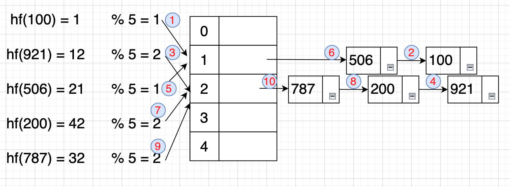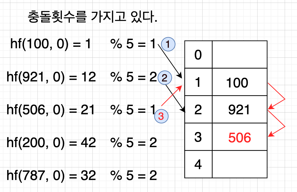 - 위의 그림에서는 충돌이 2번 일어나 i = 2까지 계산되어 0에 저장된걸 볼 수 있다.