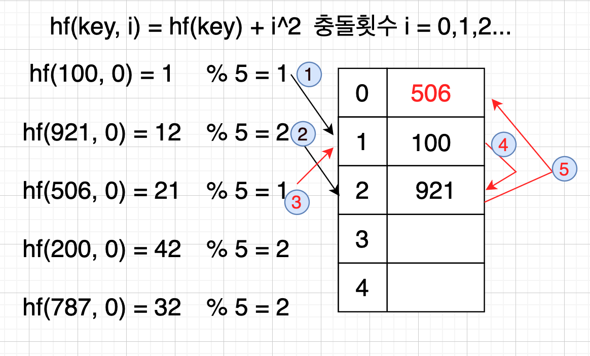 - 즉, hf(key, i) = hf(key) + i^2 이며 3번에서 충돌이 발생하면서 i의 값을 증가 시켜 계산해준다.