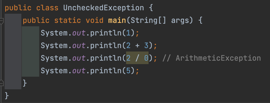 System.out.println(2 / 0)에서ArithmeticException이 발생하는 코드가 있어도 컴파일단계에서 체크를 해주지 못하는 것을 볼 수 있다.