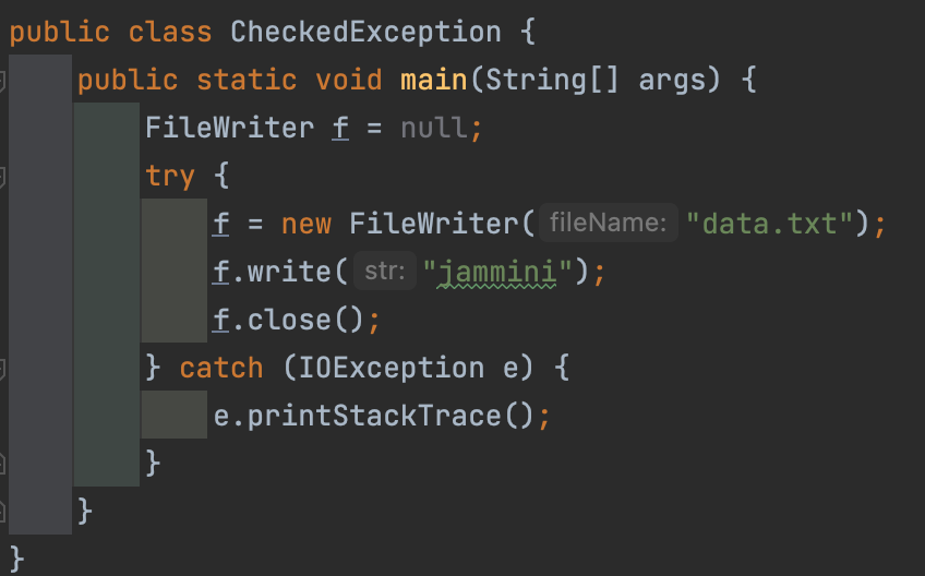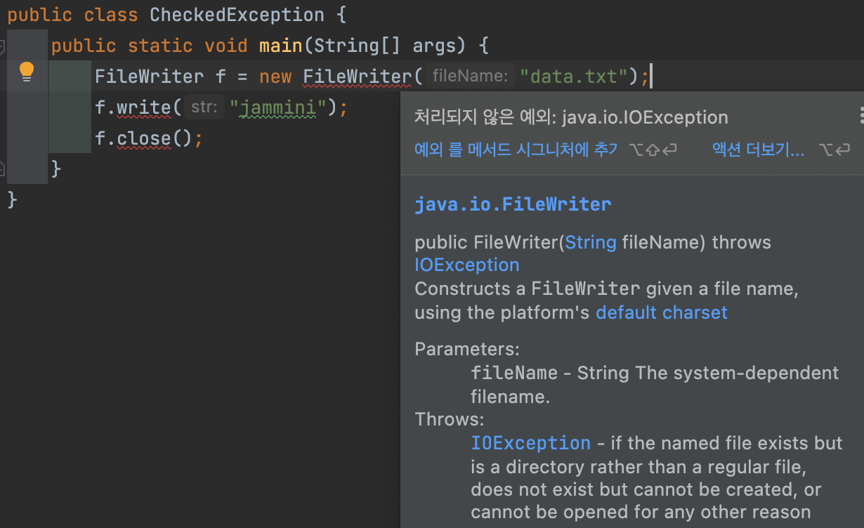 FileWriter클래스를 사용하려고 하면 위와 같이 예외를 처리하지 않았다는 경고를 볼 수 있다.- 즉, 반드시 예외처리를 해줘야 정상적으로 컴파일을 할 수 있다!