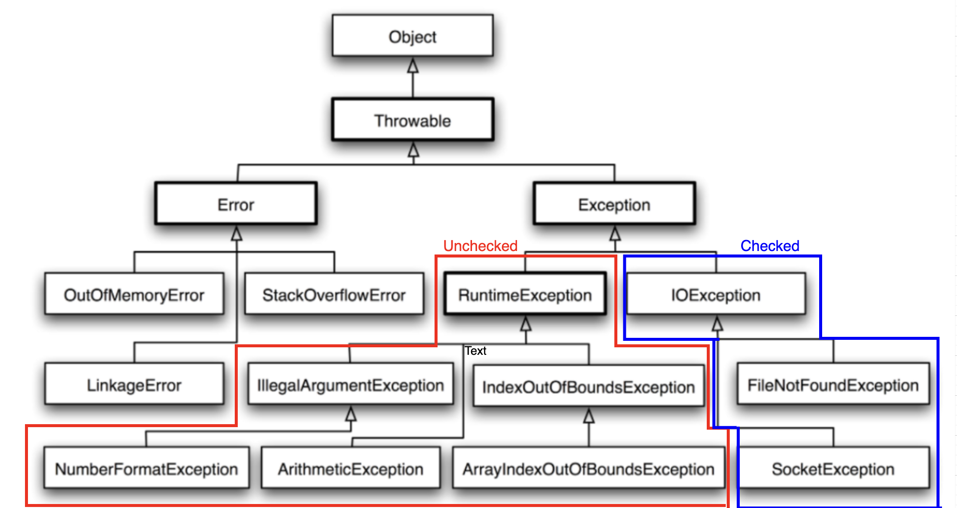 - 특히, 예외에서는 RuntimeException을 상속하지 않고 꼭 예외처리를 해줘야하는 Checked Exception과 명시적으로 예외처리를 하지 않아도 되는 Unchecked Exception을 구분된다.