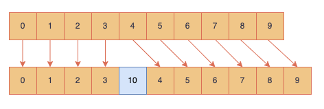 - 10을 중간 인덱스에 추가한다고 가정하면, 아래와 같이 인덱스를 다 밀어서 넣어주어야 하므로 중간에 데이터를 넣는 경우는 무조건 O(N)이 된다.