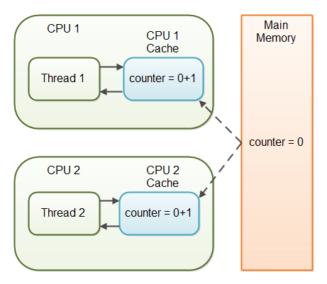 - Thread 1과 Thread 2는 메인메모리에 있는 counter 변수를 읽어 CPU Cache에 저장한다.
