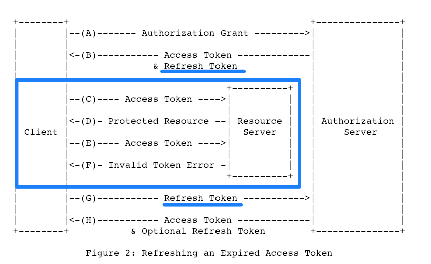 - 보통 Resource Server는 Access Token을 발급할 때 Refresh Token을 함께 발급한다. Client는 두 Token을 모두 저장해두고, Resource Server의 API를 호출할 때는 Access Token을 사용한다. Access Token이 만료되어 401 에러가 발생하면, Client는 보관 중이던 Refresh Token을 보내 새로운 Access Token을 발급받게 된다.