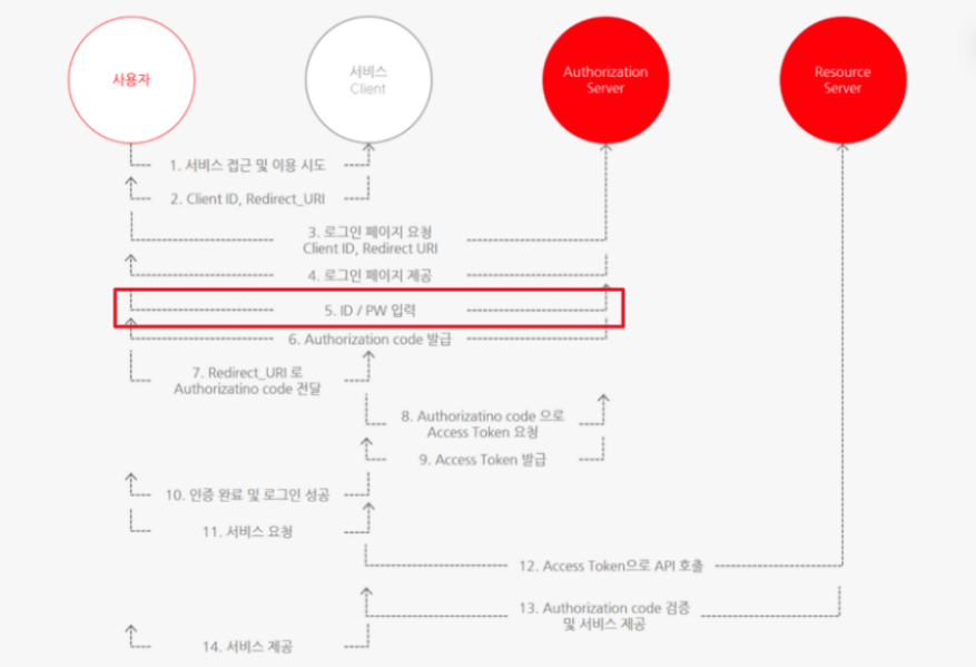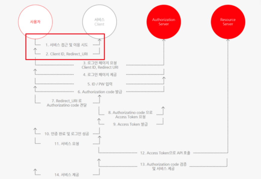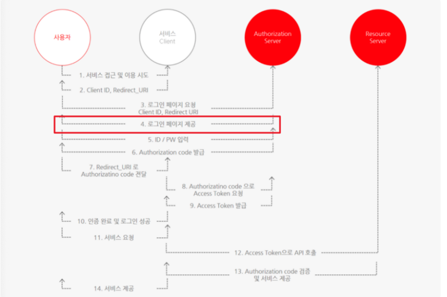 - 사용자(Resource Owner)는 서비스(client)를 이용하기 위해 로그인 페이지에 접근한다.