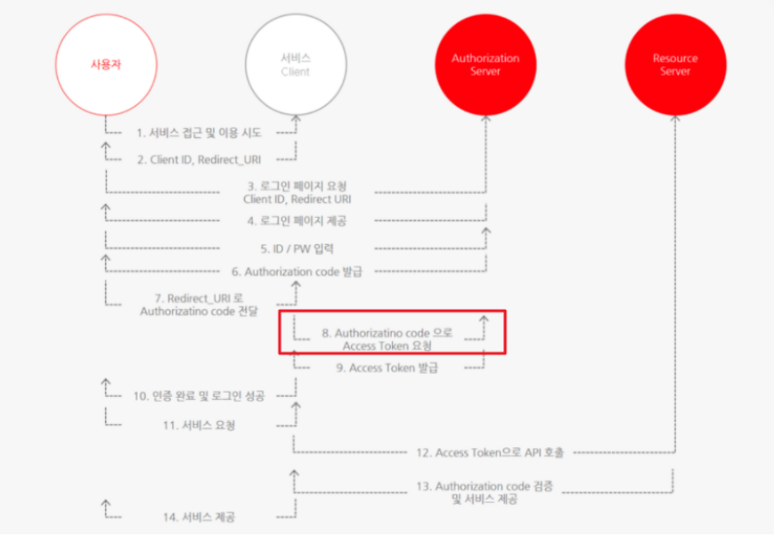 - 향후 redirect_uri 경로를 통해서 Resource Server는 client에게 임시비밀번호인 Authorization code를 제공한다.