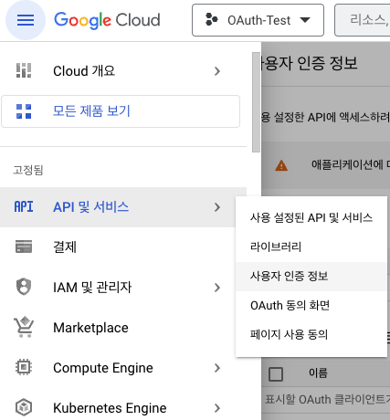 - 햄버거 박스를 눌러 API 및 서비스 > 사용자 인증 정보를 클릭한다.