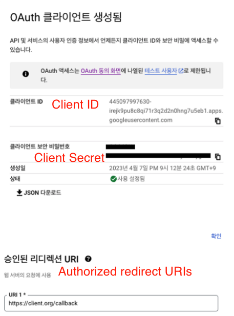 - 초반에 나온 그림 처럼 클라이언트 ID와 비밀번호(Secret)가 생성되며 Authorized redirect URIs 것을 볼 수 있다.