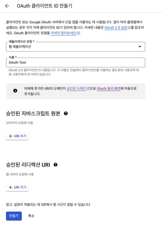 - 사용자 인증 정보 만들기에 OAuth 클라이언트 ID를 클릭해준다.