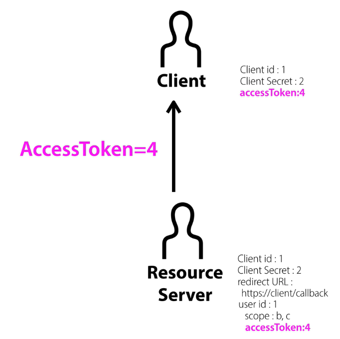 - 그럼 Resource Server는 Client가 전달한 정보들을 비교해서 일치한다면, Access Token을 발급한다. 그리고 이제 필요없어진 Authorization code는 지운다.