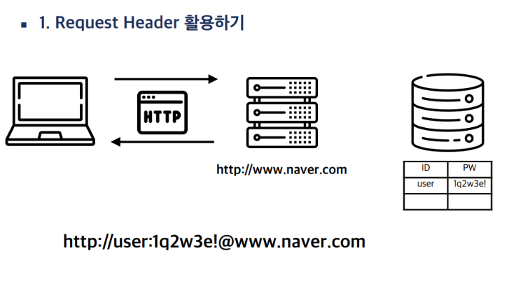 - 가장 기본적이고 단순한 형태의 인증 방식으로 사용자 ID와 password를 HTTP Request Header에 Base64 Encoding 형태로 넣어서 인증을 요청하는 방식이다.