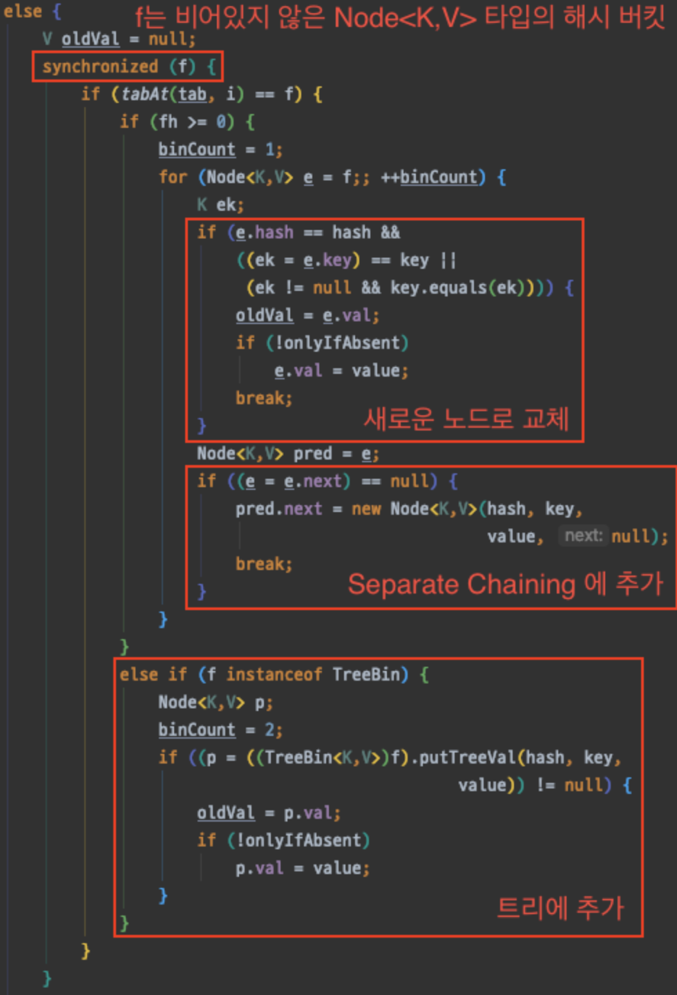 - synchronized 안의 로직은 HashMap 과 비슷한 로직이다. 동일한 Key 이면 Node 를 새로운 노드로 바꾸고, 해시 충돌(hash collision) 인 경우에는 Separate Chaining 에 추가 하거나 TreeNode 에 추가한다. TREEIFY_THRESHOLD 값에 따라 체이닝을 트리로 바꾼다.