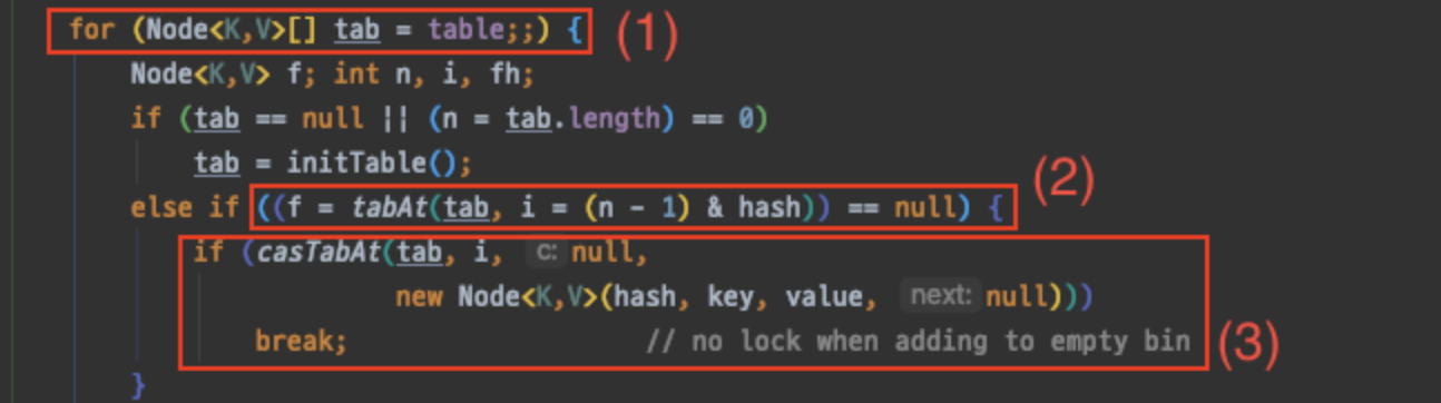 (3) 다시 Node 를 담고 있는 volatile 변수에 접근하여 Node 와 기대값(null) 을 비교하여(casTabAt 함수) 같으면 새로운 Node 를 생성해 넣고, 아니면 (1)번으로 돌아간다(재시도).