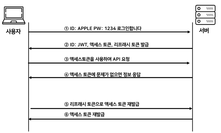 - 클라이언트가 서버에 요청을 했는데, 만일 액세스 토큰의 시간이 만료되면 클라이언트는 리프래시 토큰을 이용해서