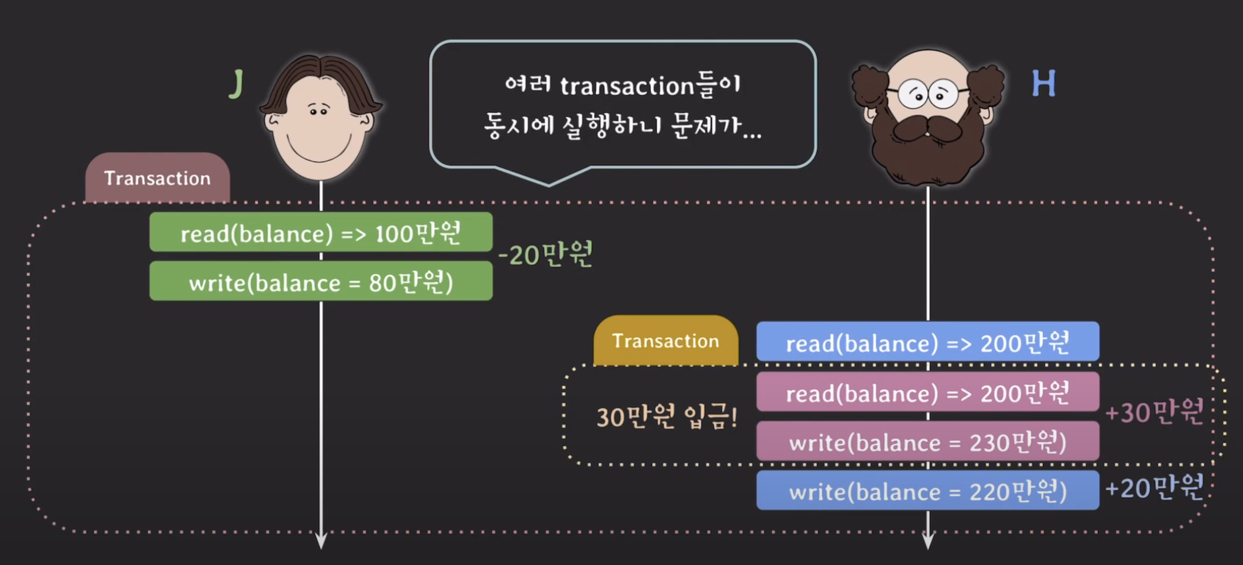 아래와 같이 J가 자신의 계좌 금액 100만원을 읽은 다음 입금할 돈 20만원을 빼고 80만원을 쿼리에 썼다.