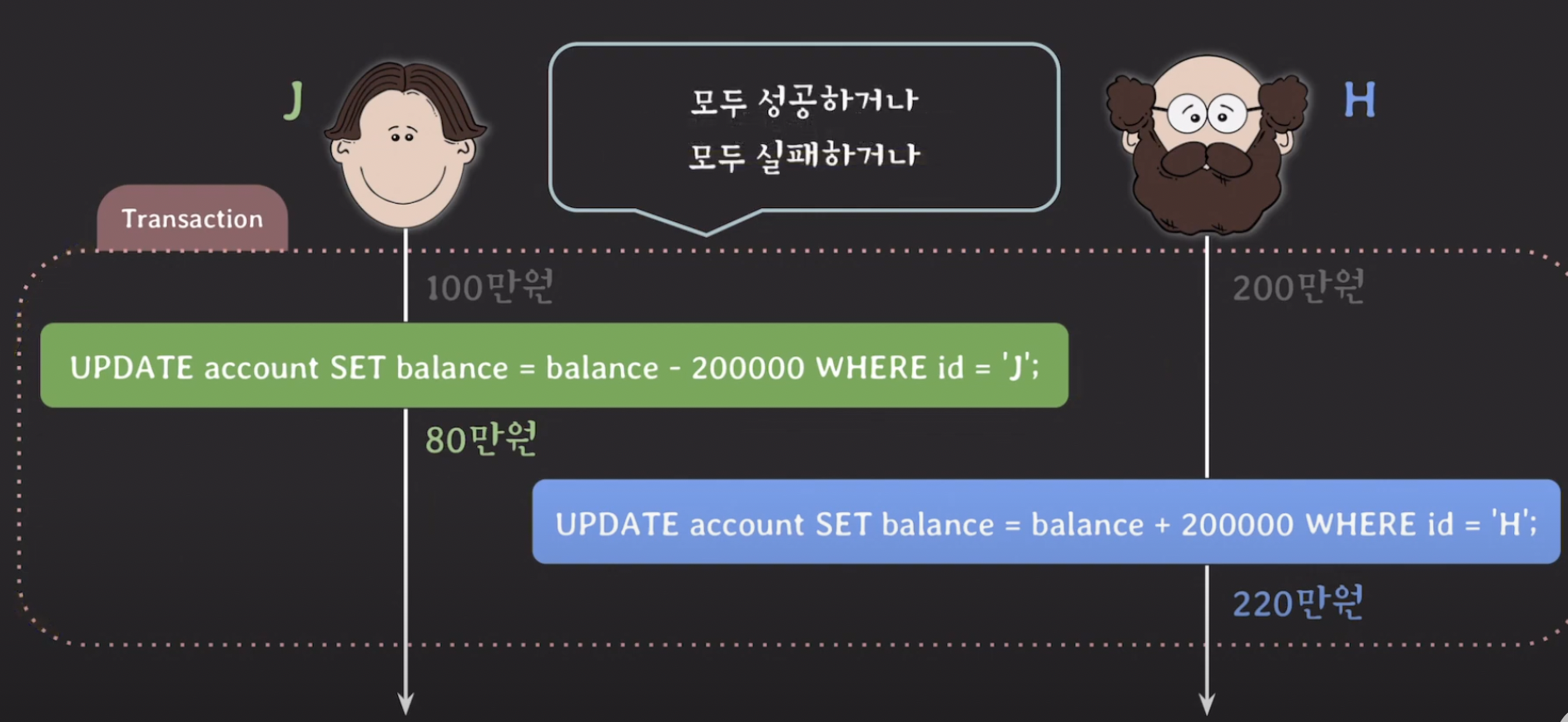 - 트랜잭션은 논리적으로 쪼개질 수 없는 작업 단위이기 때문에 내부의 SQL문들이 모두 성공해야 한다.