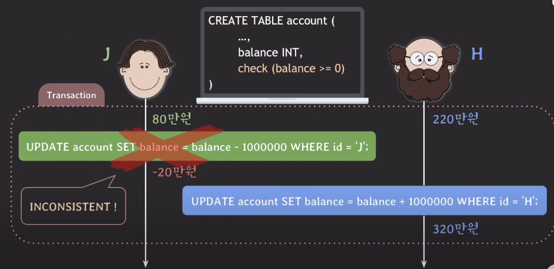 계좌의 잔액은 0원 이상 있어야 된다는 체크사항을 걸어두어 J가 -20만원이 되어서는 안되기에 J에 업데이트문을 실행할 수 없다고 알려주고 rollback 을 실행시켜준다.