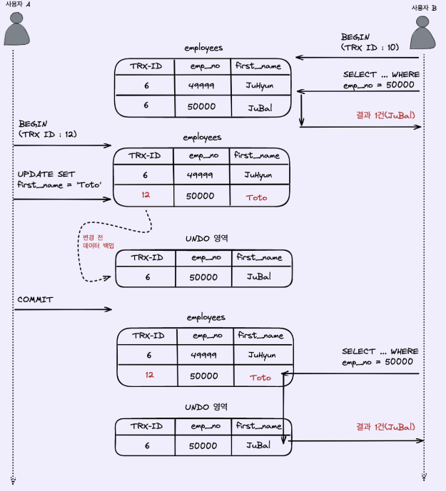 사용자 A는 emp_no = 50000인 사원의 first_name을 "JuBal"에서 "Toto"로 수정했는데, 이 때 새로운 값인 "Toto"는 employees 테이블에 즉시 기록되고 이전 값인 "JuBal"은 Undo 영역으로 백업된다. 만약 사용자 A가 이러한 변경 내역을 커밋하기전에 사용자 B가 emp_no = 50000인 사원을 조회하면 결과값은 "Toto"가 아닌 이전 값인 "JuBal"이 조회가 된다. 여기서 사용자 B의 SELECT 쿼리 결과는 employees 테이블이 아닌 UNDO 영역의 백업된 레코드에서 가져온 결과이다.