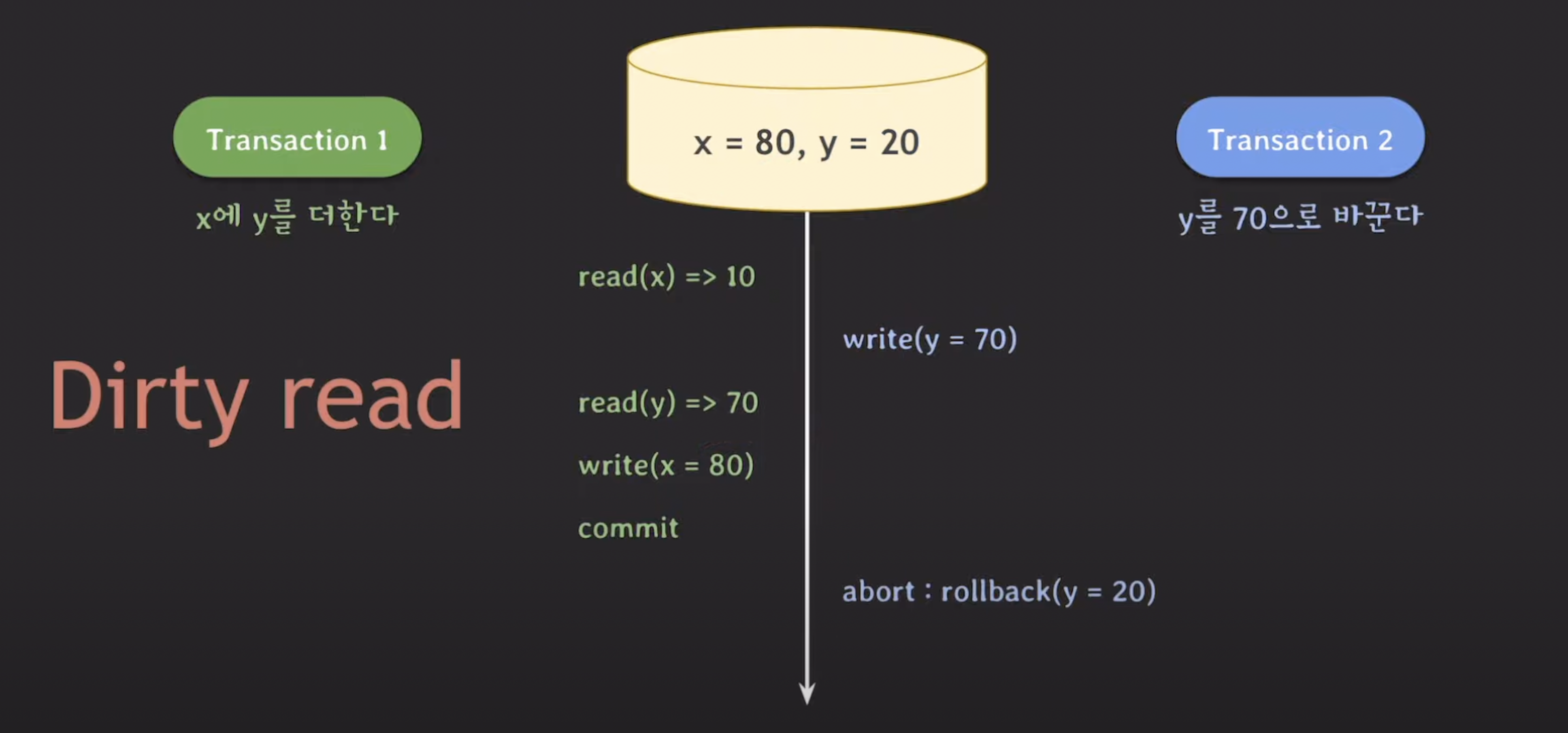 하지만, 트랜잭션 2번이 종료되기전 어떠한 이유로 인해 중단되어 롤백이 된다면 y는 기존 값이었던 20으로 되돌아 가버리게 된다.