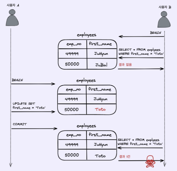 위 그림에서 사용자 B가 BEGIN 명령으로 트랜잭션을 시작하고 first_name = 'Toto'인 사원을 조회하면 일치하는 데이터가 존재하지 않는다.