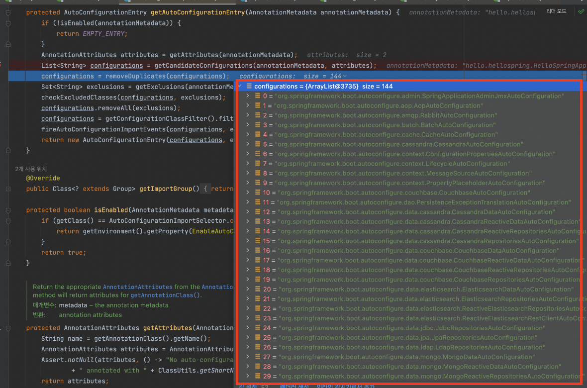 쭉 따라 가다 보면 파일을 읽어 스프링 빈으로 등록되어지고 Auto Configuration으로 설정이 된 것을 볼 수 있다.