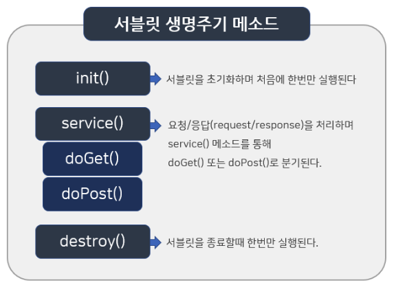 - 서블릿 컨테이너는 서블릿 객체를 생성, 초기화, 호출, 종료하는 생명주기 관리