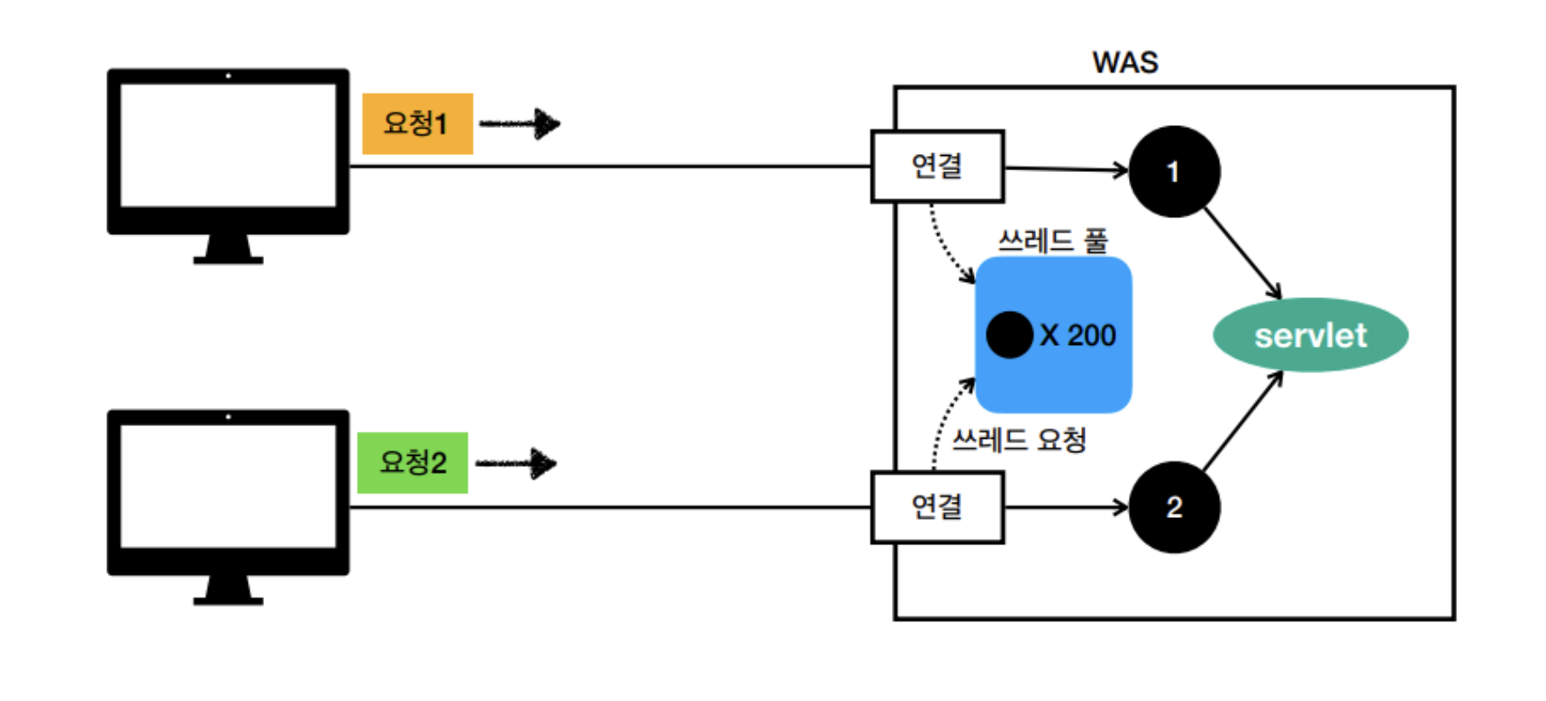- 만약 한 요청을 처리하기전에 다른 요청이 들어오면 동시 요청을 처리하기 위해 멀티쓰레드로 사용한다