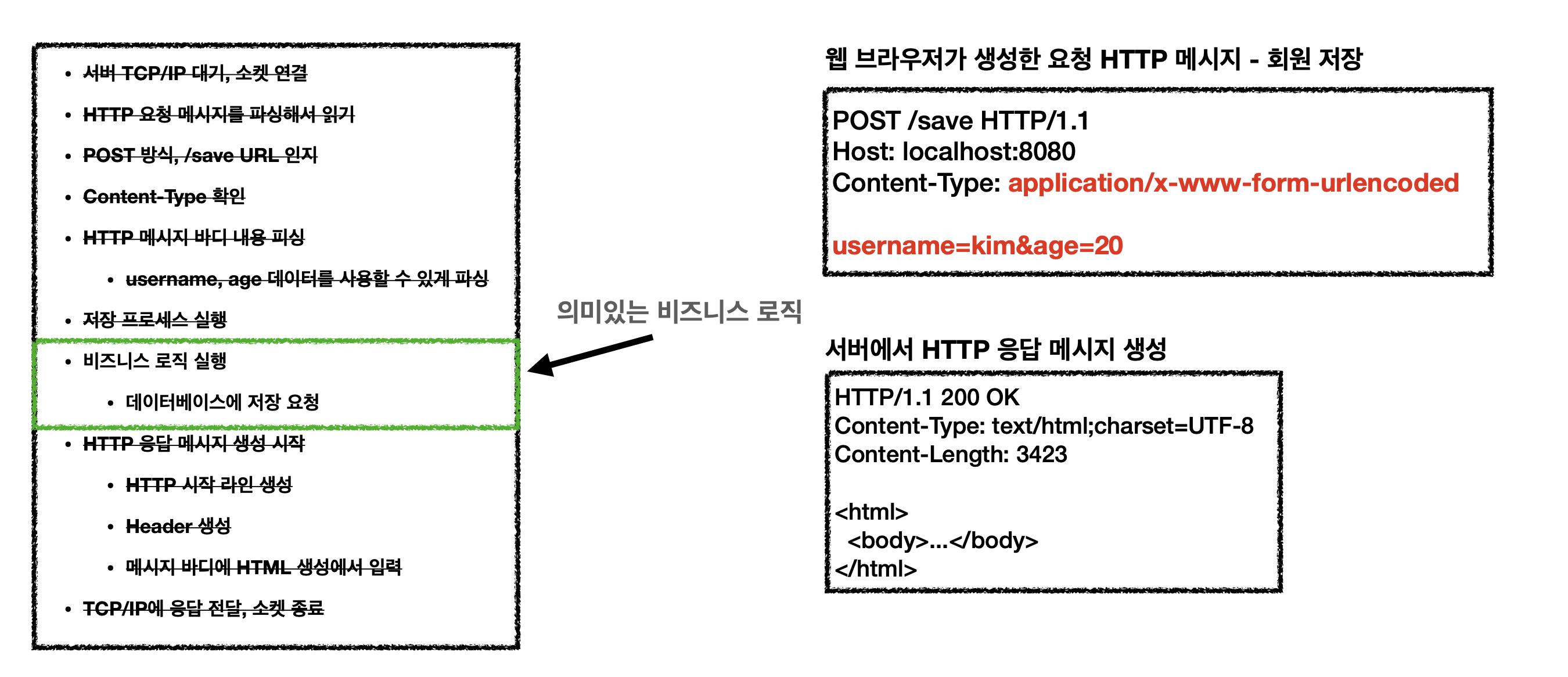 위와 같이 서버에서 처리해야 하는 업무들이 많지만 서블릿을 지원하는 WAS를 사용하면 초록색 박스와 같은 의미있는 비즈니스 로직을 제외한 모든일들을 대신 처리해준다.