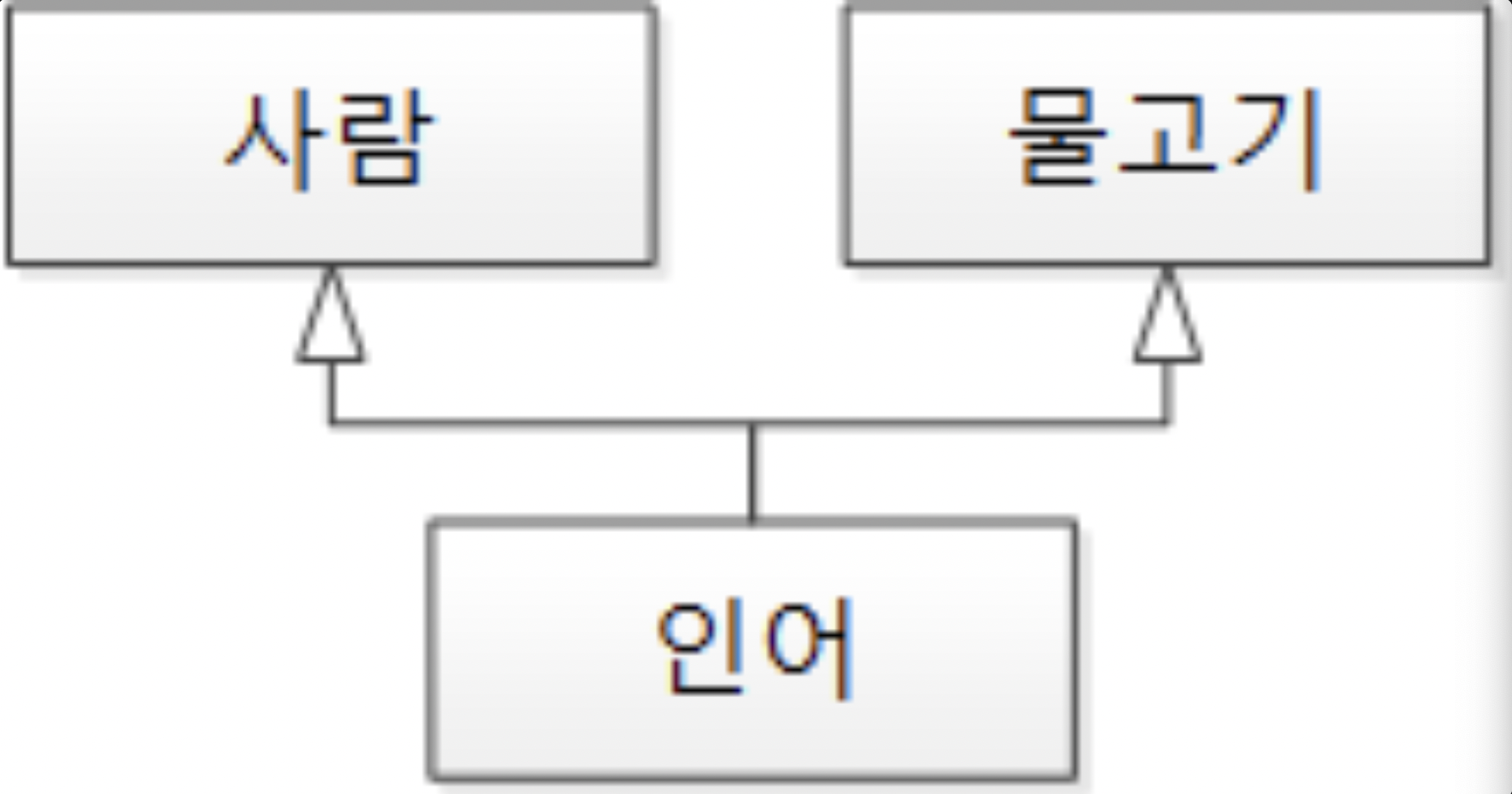 위와 같이 인어라는 클래스는 사람클래스와 물고기 클래스 모두를 상속 받을 수 있다. 만약 인어에게 사람의 기능인 달리기를 해본다던지, 물고기 기능인 아가미로 숨을 셔보라든지 기능들이 상이하게 된다.