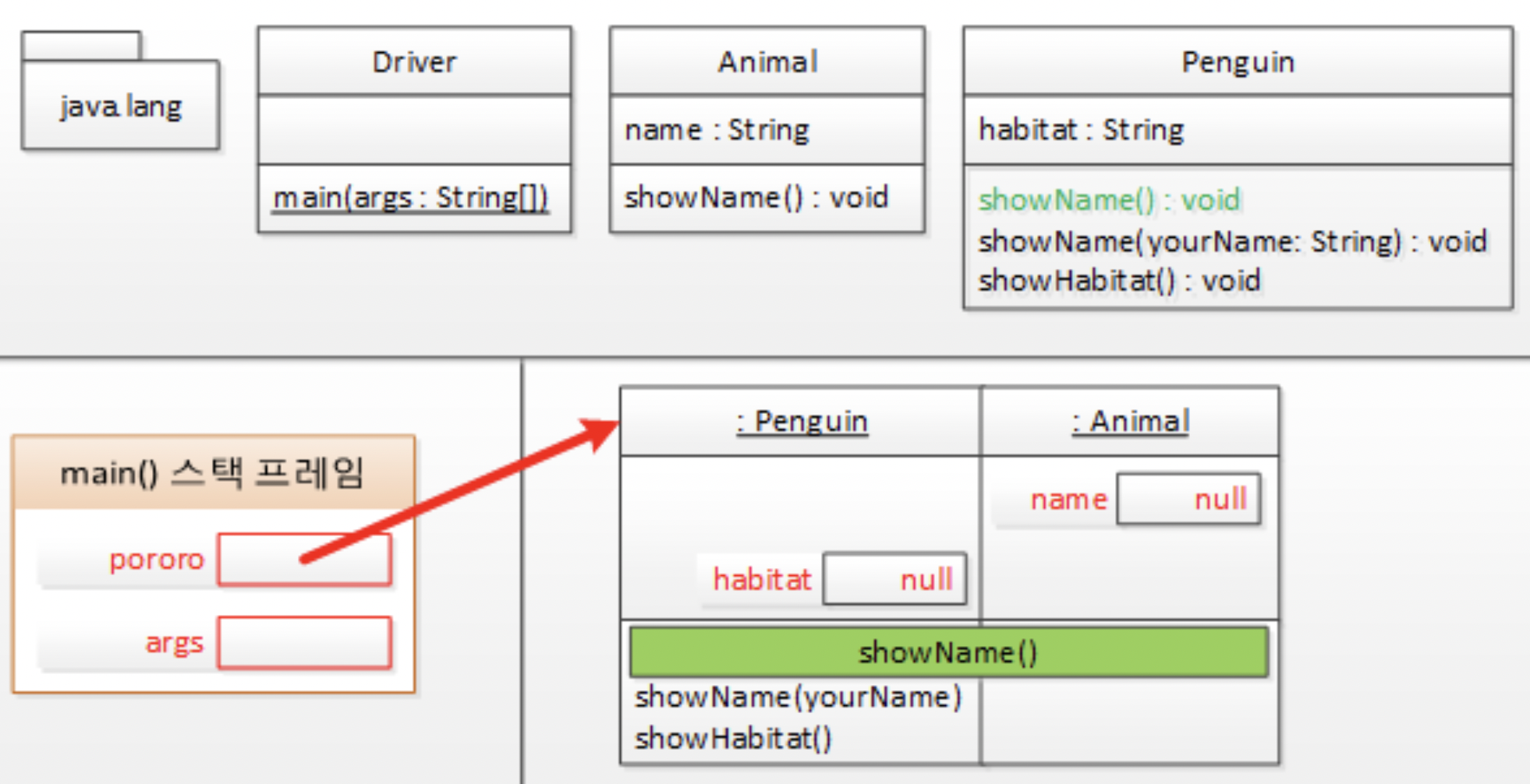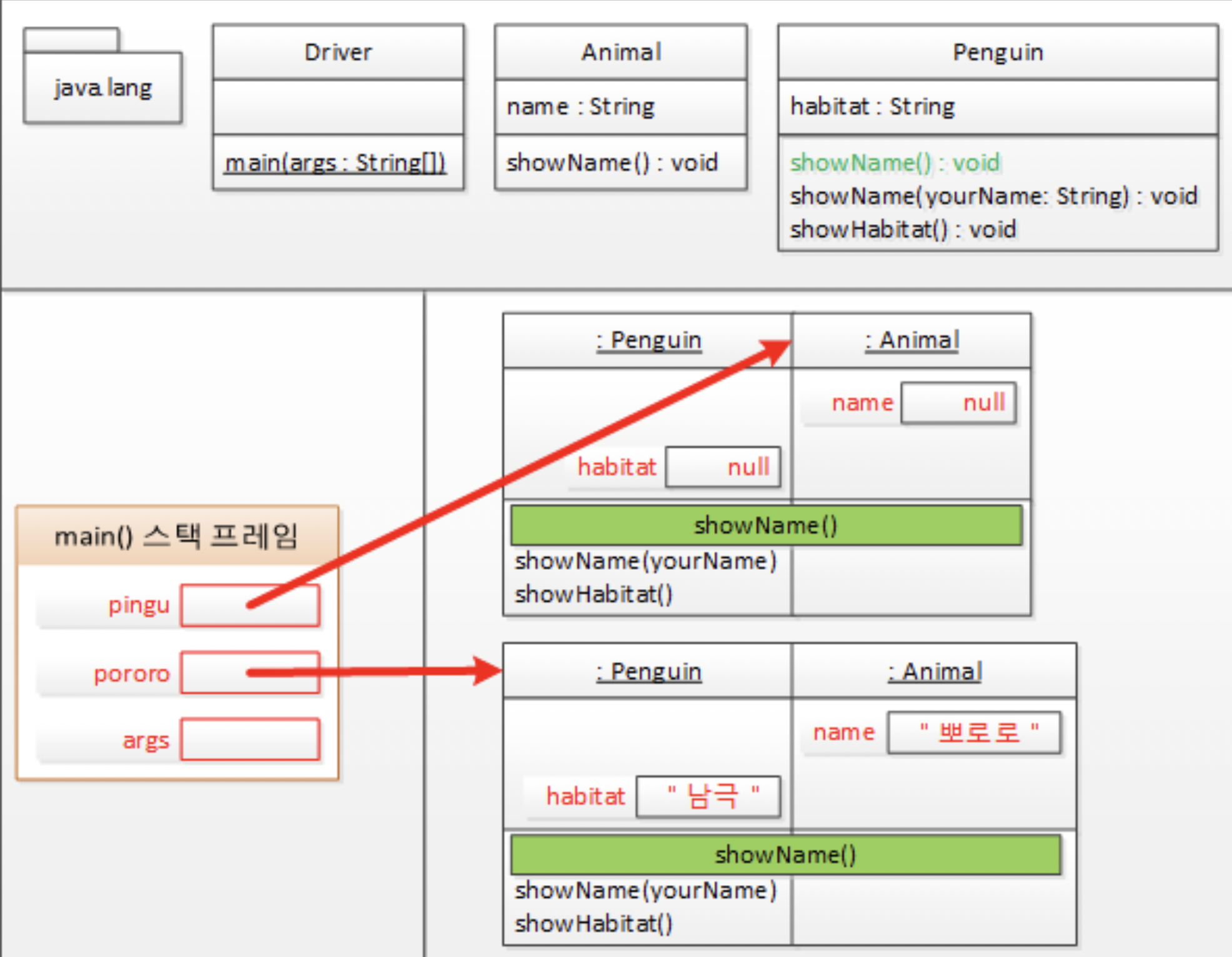 따라서, pororo.showName을 호출하면 Penguin 클래스에서 재정의한 showName메소드가 실행된다.