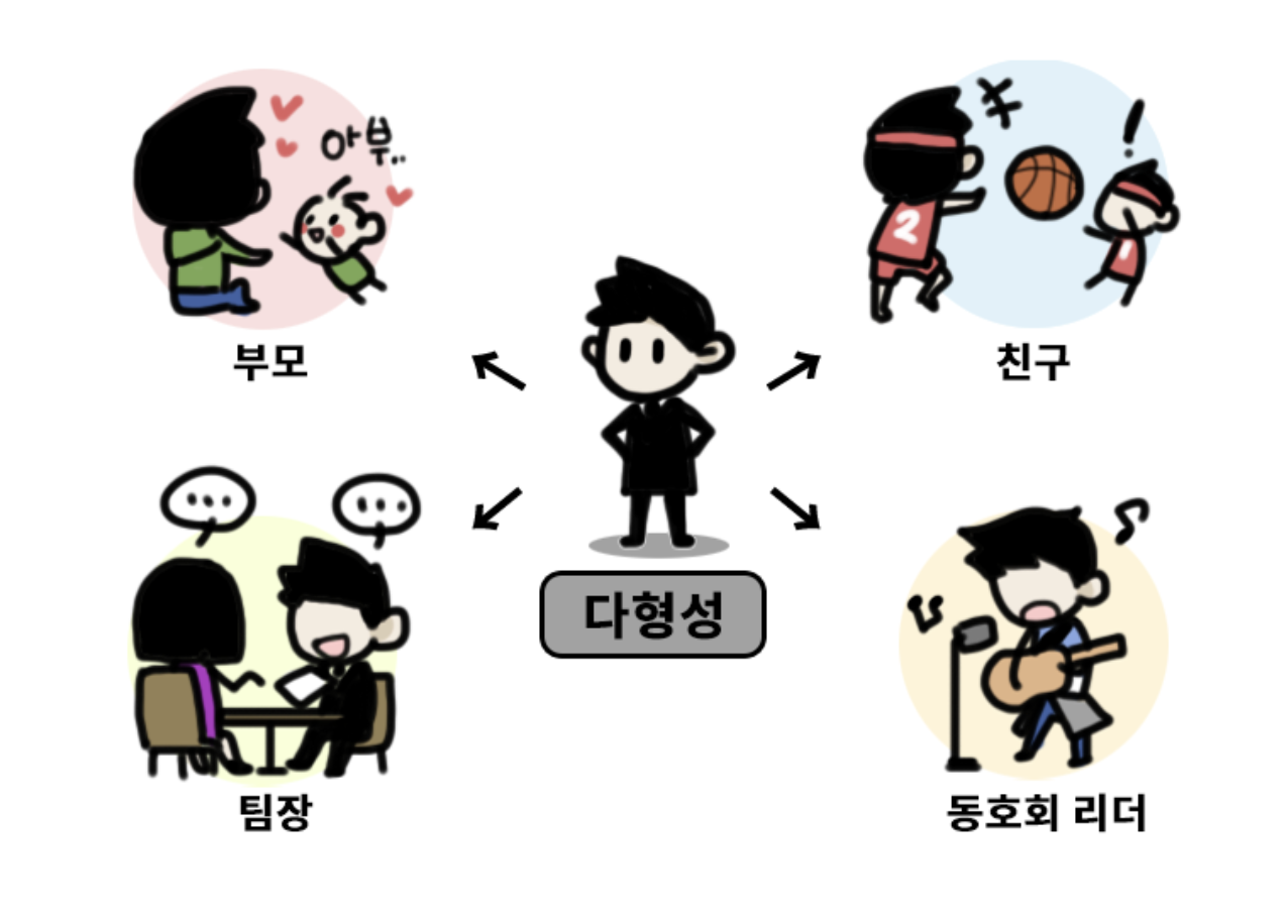 그림으로 보면 아래와 같이 한명의 남성이 자식에게는 부모이고 회사에서는 팀장이 되듯이 상황과 환경에 따라 달라지는 것과 비슷하다고 볼 수 있다.