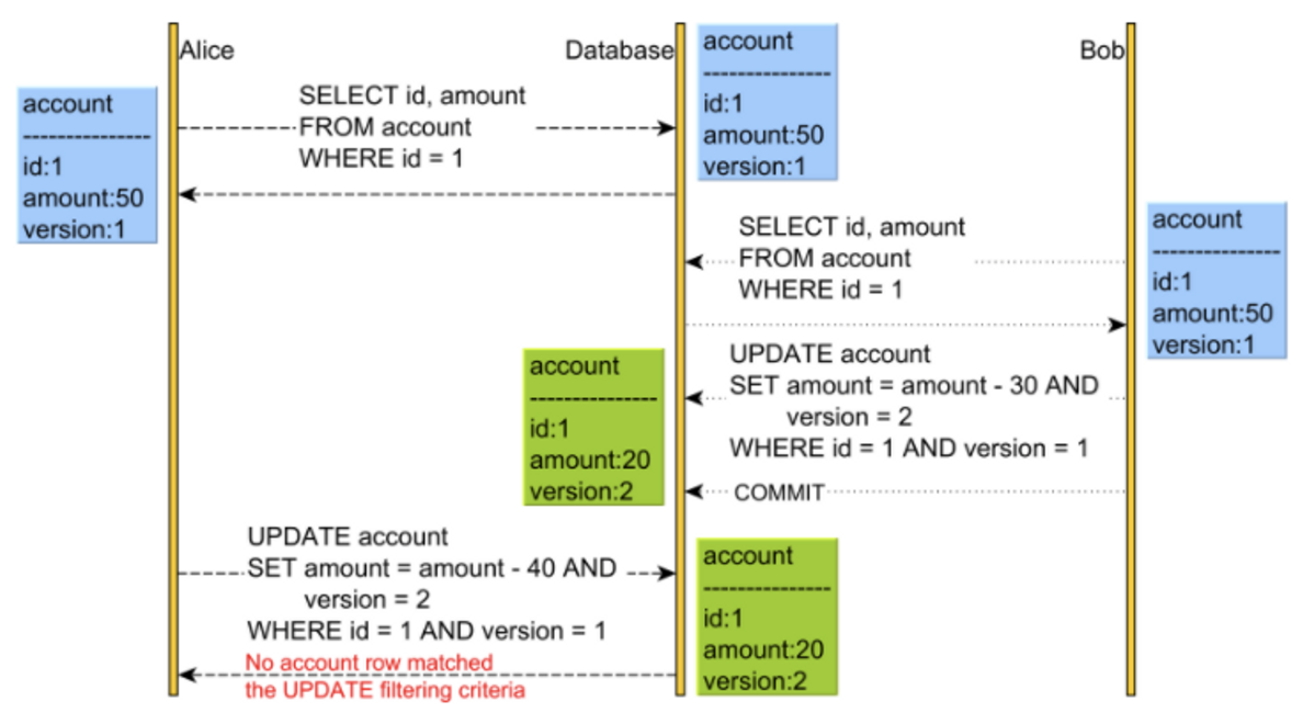 - Bob이 먼저 업데이트 커밋을 보내게 되면서 Version이 2로 올라간다.