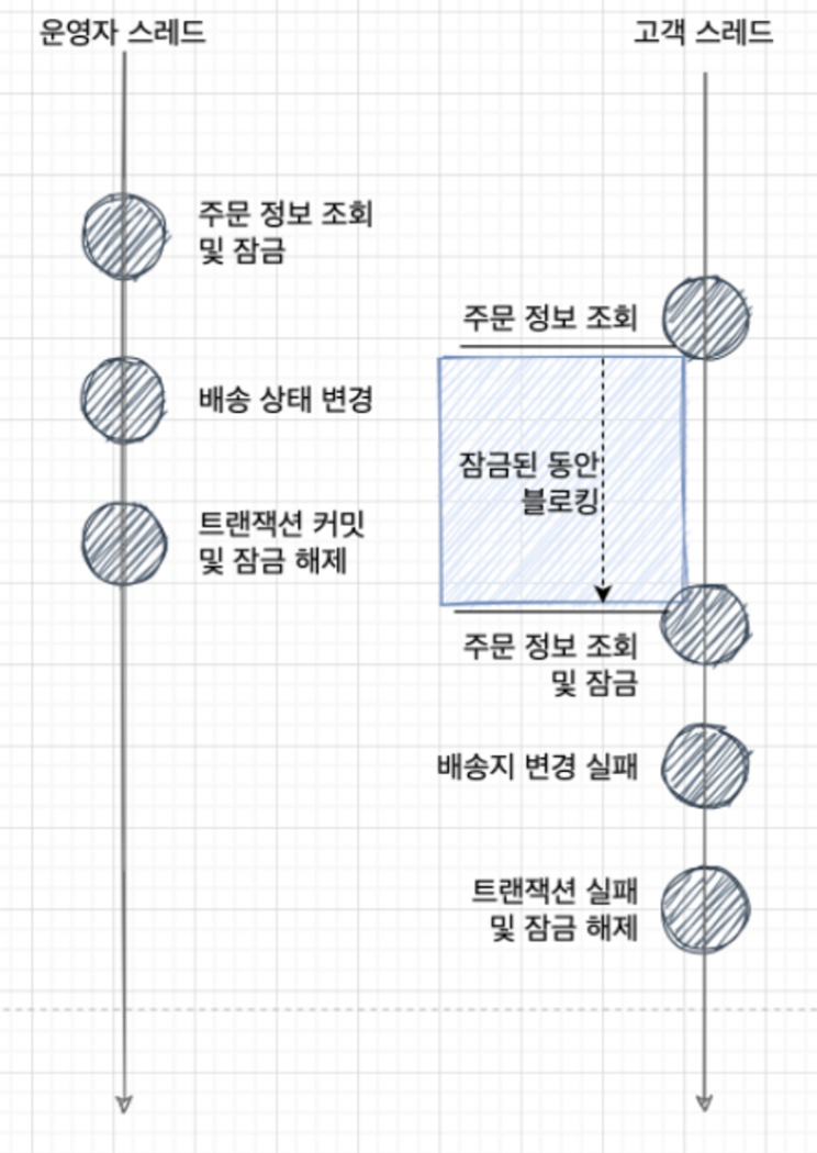 - 운영자가 주문 정보를 조회한다. 이 순간 데이터에 락이 걸린다.