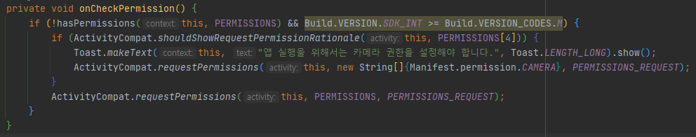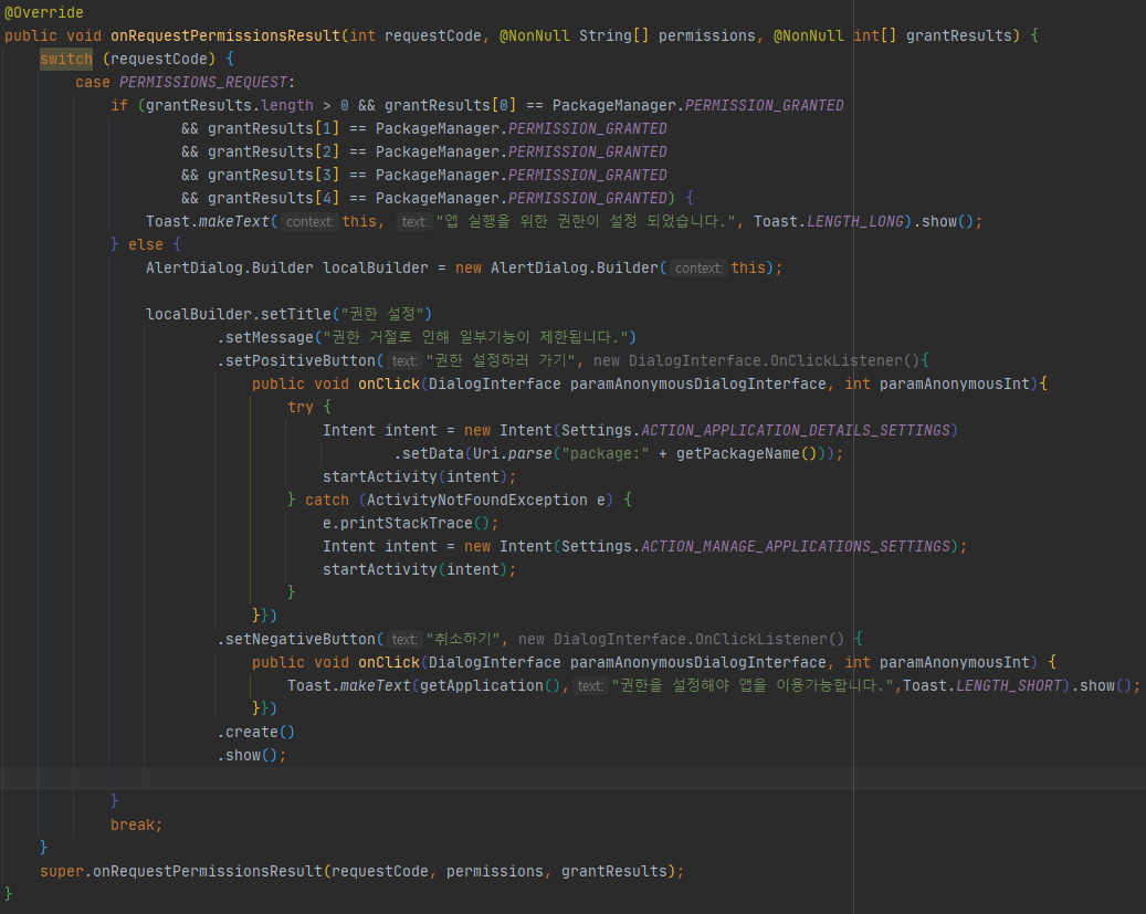 모든 권한 요청이 처리 되었다면 간단하게 Toast 메세지를 띄어 주었고 그렇지 않다면 Dialog를 하나 띄어 권한 수동으로 권한 설정할 수 있는 시스템 창을 띄었습니다.